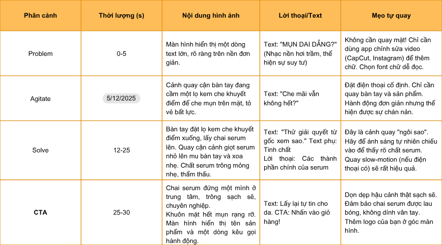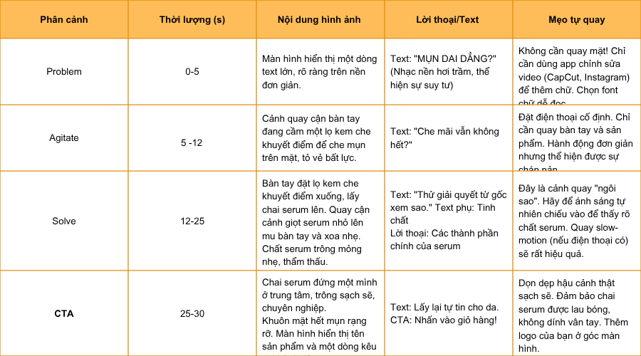 Mẫu 1: Kịch Bản video Quảng Cáo Mỹ Phẩm - Serum Trị Mụn (Công thức PAS - 30 giây)