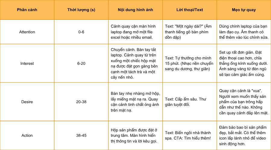 Mẫu 2: Kịch Bản video Quảng Cáo cho ngành Spa/Thẩm Mỹ - Mặt Nạ Thư Giãn Tại Nhà (Công thức AIDA - 45 giây)