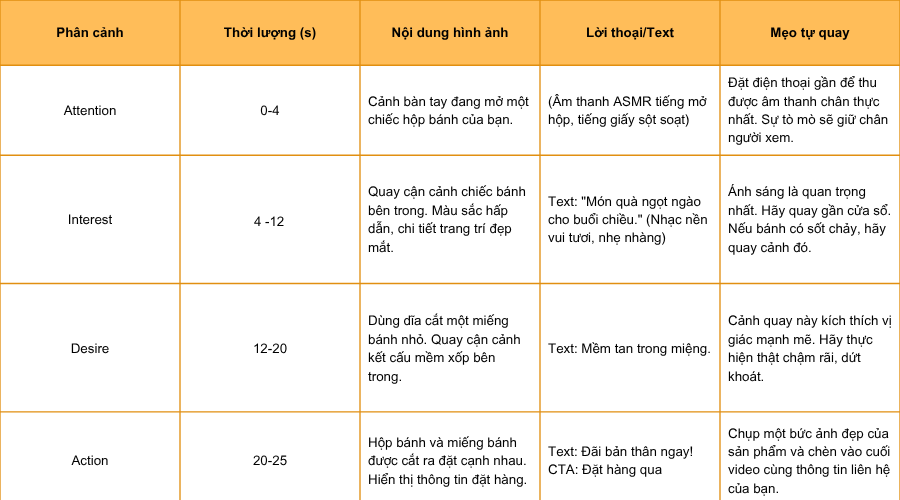 Mẫu 3: Kịch Bản Video Quảng Cáo Đồ Ăn - Bánh Ngọt (Công thức AIDA - 25 giây)