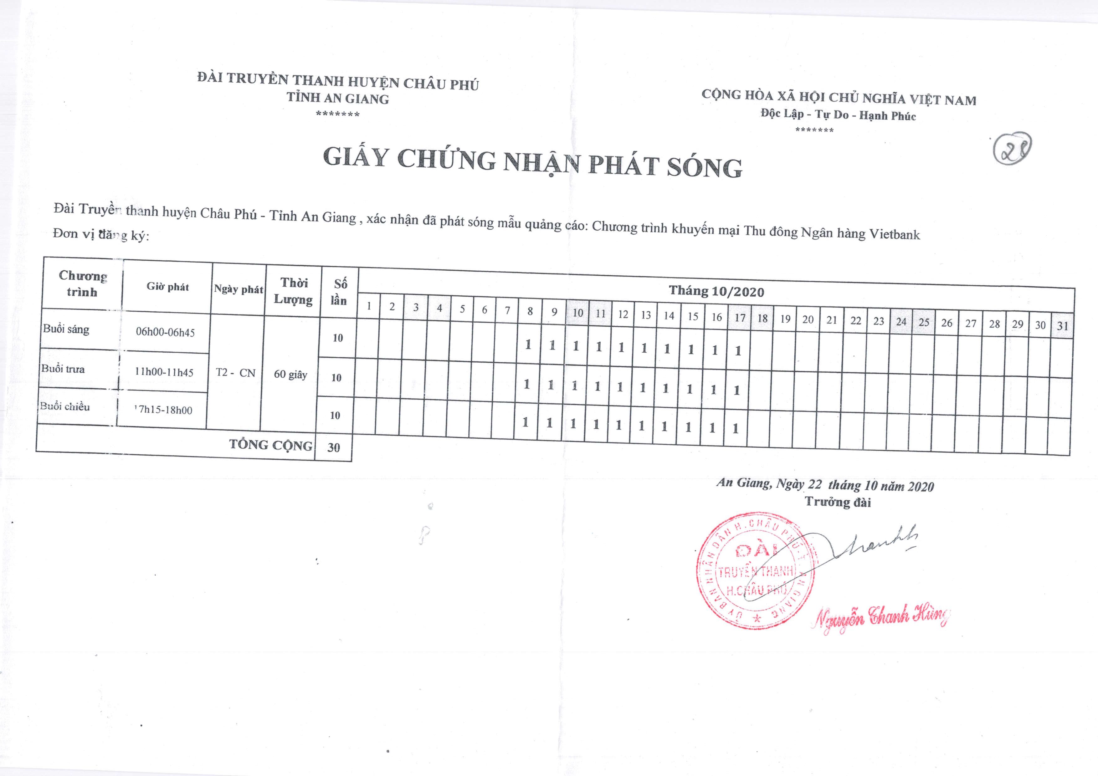 Mẫu giấy chứng nhận phát sóng quảng cáo loa phát thanh do RadioAd cung cấp