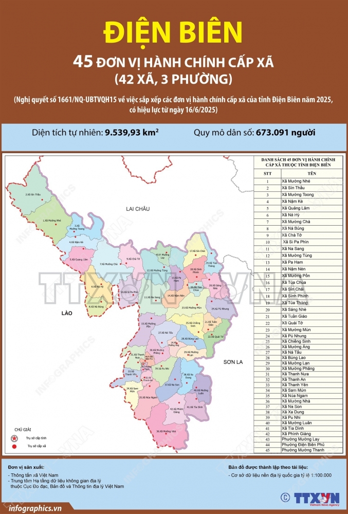 - Sau khi sắp xếp, tỉnh Điện Biên có 45 đơn vị hành chính cấp xã, gồm 42 xã và 03 phường.