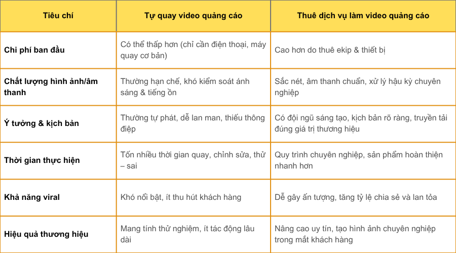 Nhiều doanh nghiệp nghĩ rằng tự quay sẽ tiết kiệm chi phí, nhưng thực tế lại tiềm ẩn nhiều hạn chế. Để bạn dễ hình dung, dưới đây là bảng so sánh nhanh giữa Tự quay và Thuê dịch vụ chuyên nghiệp: